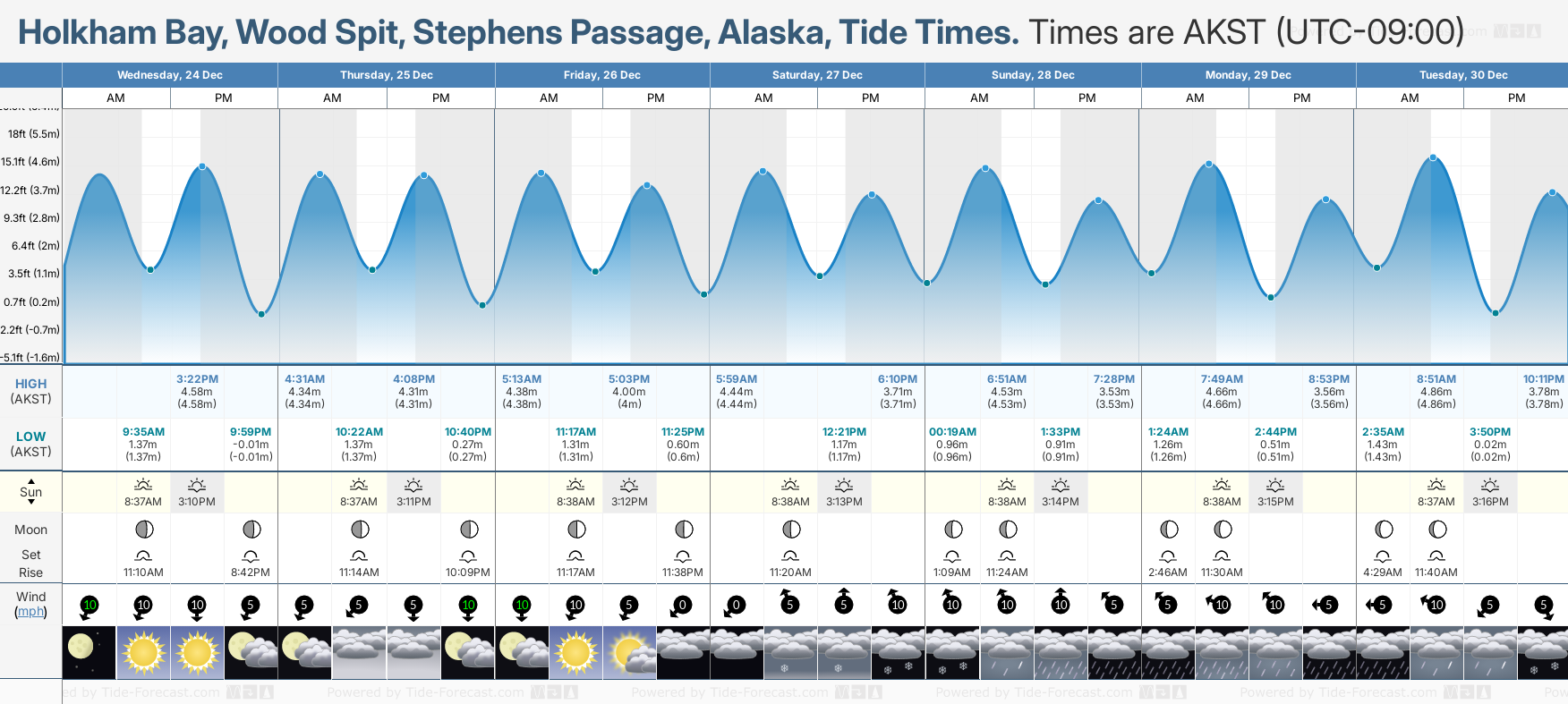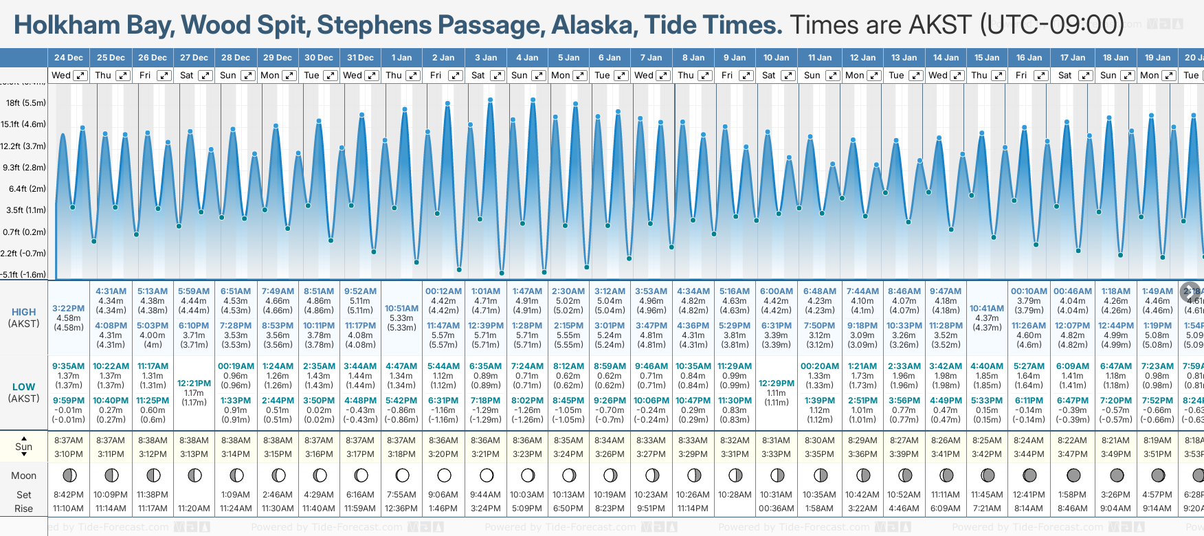 Tide Times are AKST (UTC -9.0hrs). Last Spring High Tide at Holkham Bay, Wood Spit, Stephens Passage was on Sun 21 Dec (height: 4.98m 16.3ft). Next high Spring Tide at Holkham Bay, Wood Spit, Stephens Passage will be on Sat 03 Jan (height: 5.71m 18.7ft).