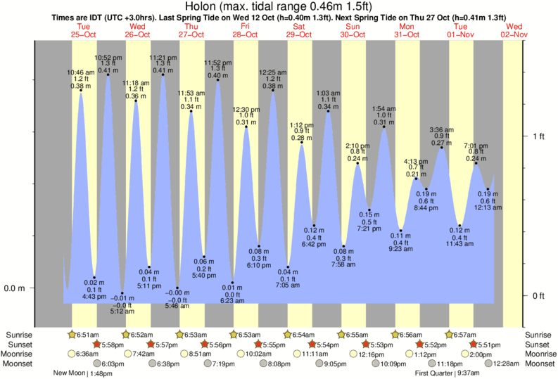 Tide Times are IST (UTC +2.0hrs). Last Spring High Tide at Holon was on Sat 06 Dec (height: 0.42m 1.4ft). Next high Spring Tide at Holon will be on Sun 21 Dec (height: 0.38m 1.2ft).