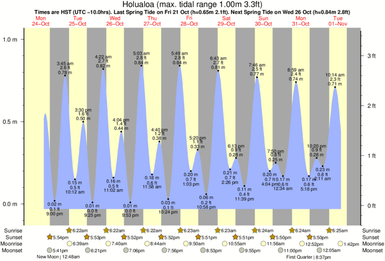 Tide Times are HST (UTC -10.0hrs). Last Spring High Tide at Holualoa was on Thu 04 Dec (height: 0.98m 3.2ft). Next high Spring Tide at Holualoa will be on Sat 20 Dec (height: 0.84m 2.8ft).