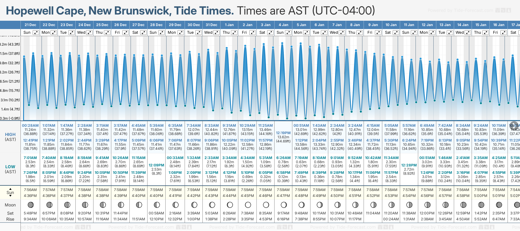 Tide chart for Hopewell CapeShowing low and high tide times for the next 30 days at Hopewell Cape. Tide Times are AST (UTC -4.0hrs).