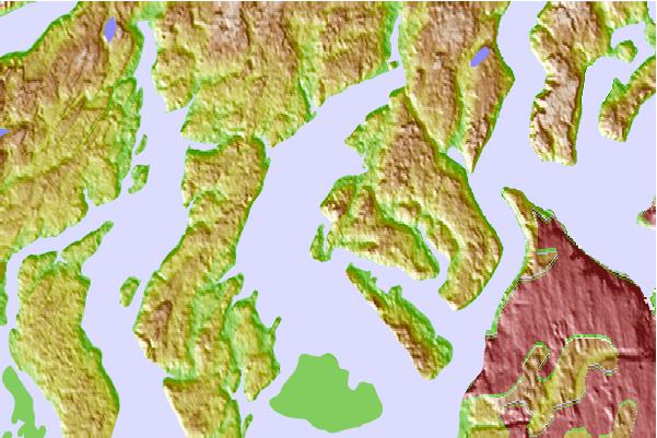 Use this relief map to navigate to tide stations, surf breaks and cities that are in the area of Horsehead Bay, Carr Inlet, Puget Sound, Washington.