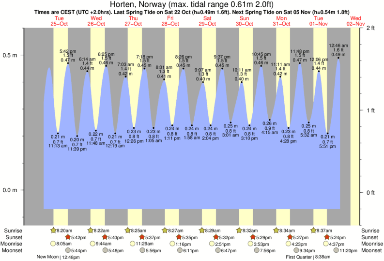 December and January Tide charts for Horten: The tide charts below show the height, time and date of high and low tides for the next 30 days.