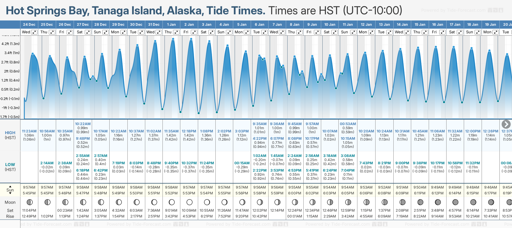 December and January Tide charts for Hot Springs Bay, Tanaga Island: The tide charts below show the height, time and date of high and low tides for the next 30 days.