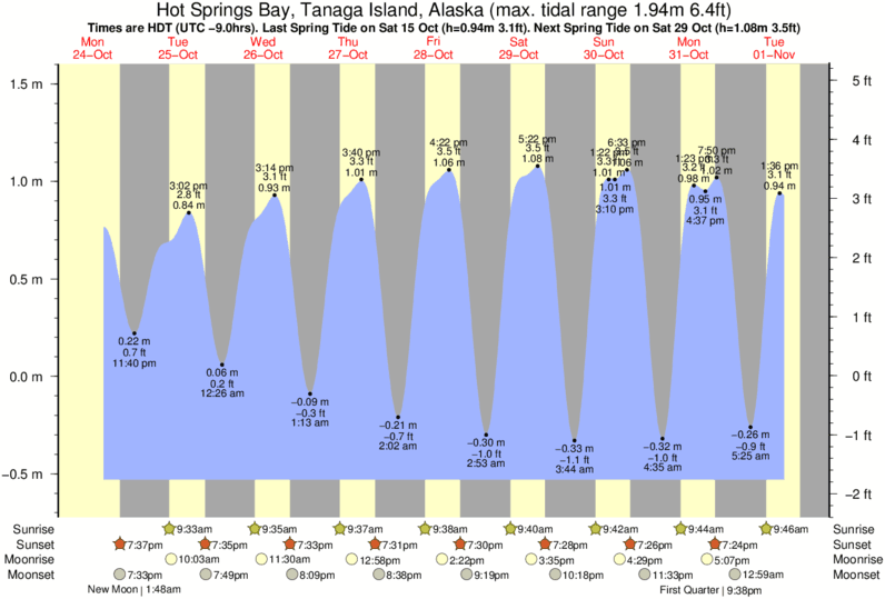 Tide Times are HST (UTC -10.0hrs). Last Spring High Tide at Hot Springs Bay, Tanaga Island was on Fri 05 Dec (height: 1.37m 4.5ft). Next high Spring Tide at Hot Springs Bay, Tanaga Island will be on Sat 20 Dec (height: 1.24m 4.1ft).