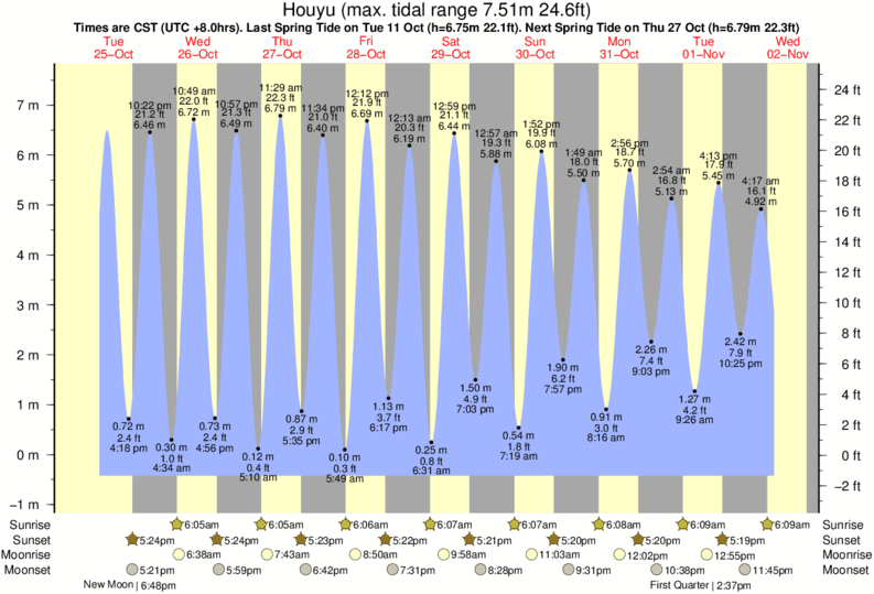 Tide Times are CST (UTC +8.0hrs). Last Spring High Tide at Houyu was on Sat 06 Dec (height: 6.88m 22.6ft). Next high Spring Tide at Houyu will be on Mon 05 Jan (height: 6.72m 22.0ft).