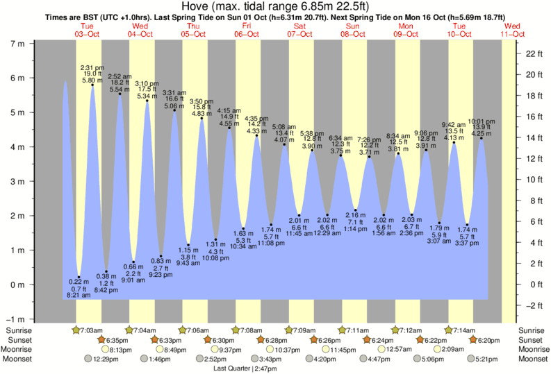 Tide Times are GMT (UTC +0hrs). Last Spring High Tide at Hove was on Sat 06 Dec (height: 5.99m 19.7ft). Next high Spring Tide at Hove will be on Mon 22 Dec (height: 5.23m 17.2ft).