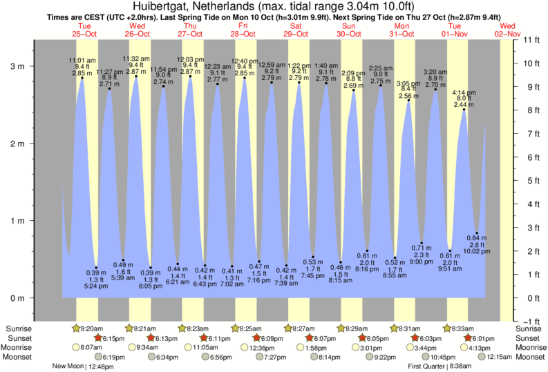 Tide Times are CET (UTC +1.0hrs). Last Spring High Tide at Huibertgat was on Tue 09 Dec (height: 2.88m 9.4ft). Next high Spring Tide at Huibertgat will be on Wed 24 Dec (height: 2.79m 9.2ft).