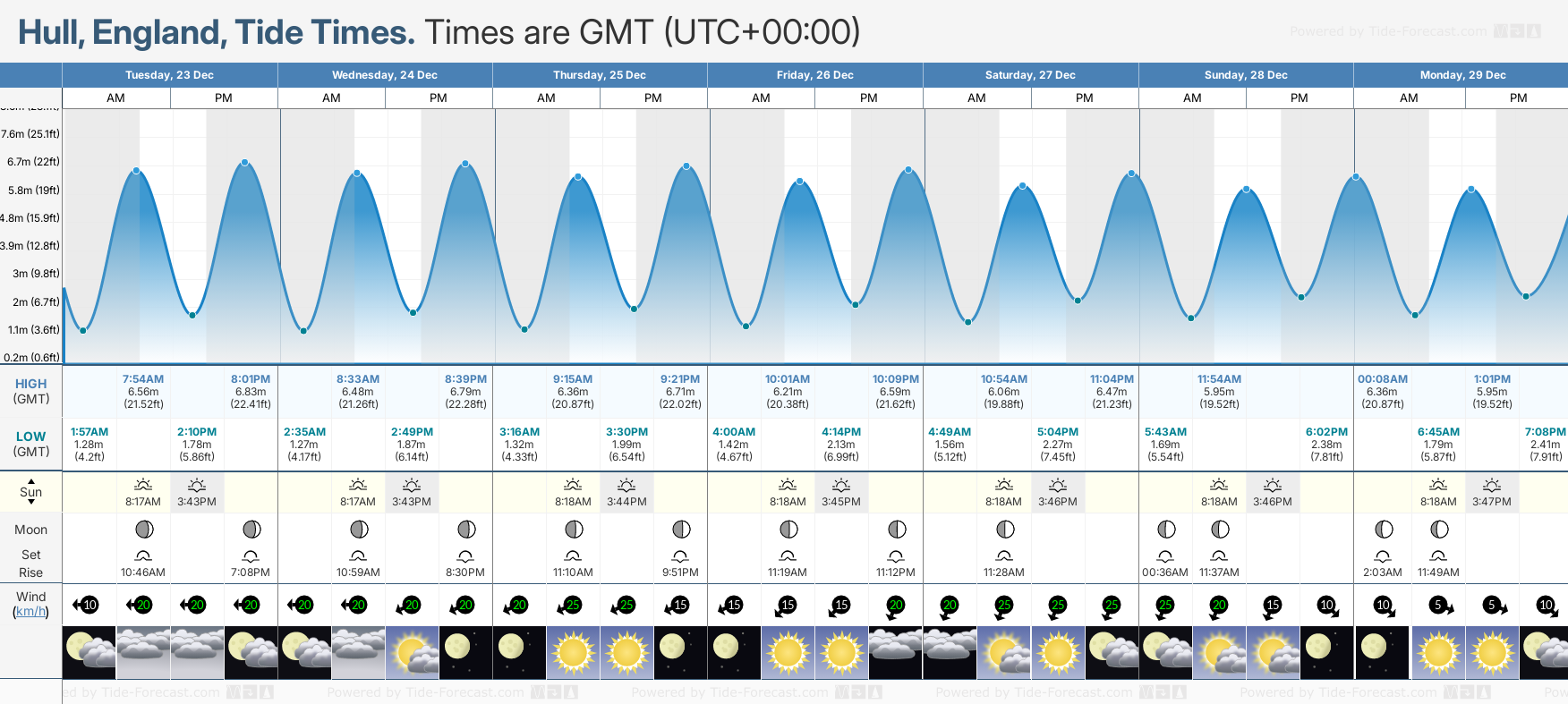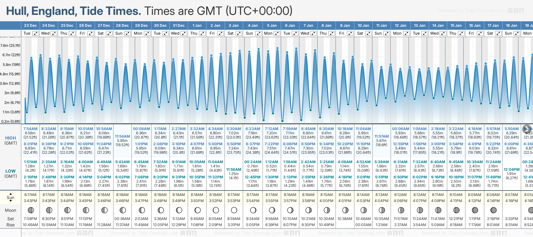 December and January Tide charts for Hull: The tide charts below show the height, time and date of high and low tides for the next 30 days.