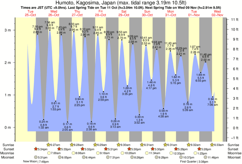 Tide Times are JST (UTC +9.0hrs). Last Spring High Tide at Humoto was on Sat 06 Dec (height: 2.74m 9.0ft). Next high Spring Tide at Humoto will be on Sun 21 Dec (height: 2.69m 8.8ft).