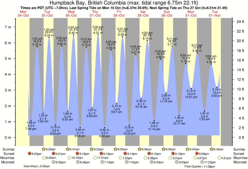 Humpback Bay tide chart key: The tide chart above shows the height and times of high tide and low tide for Humpback Bay, British Columbia. The grey shading corresponds to nighttime hours between sunset and sunrise at Humpback Bay.