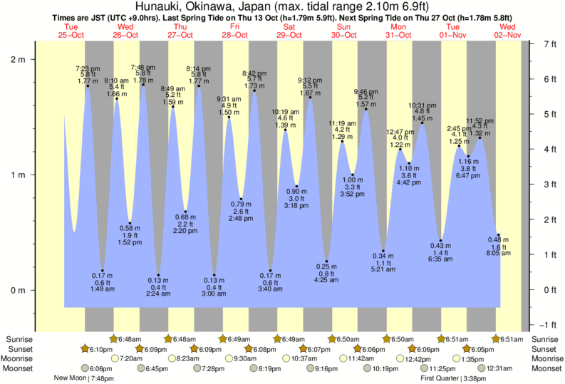 Tide Times are JST (UTC +9.0hrs). Last Spring High Tide at Hunauki was on Sun 07 Dec (height: 1.71m 5.6ft). Next high Spring Tide at Hunauki will be on Mon 05 Jan (height: 1.66m 5.4ft).