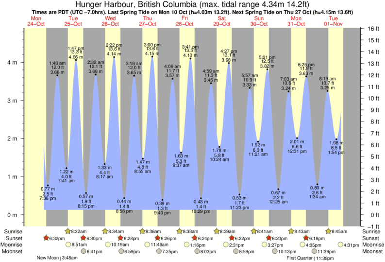 Hunger Harbour tide chart key: The tide chart above shows the height and times of high tide and low tide for Hunger Harbour, British Columbia. The grey shading corresponds to nighttime hours between sunset and sunrise at Hunger Harbour.