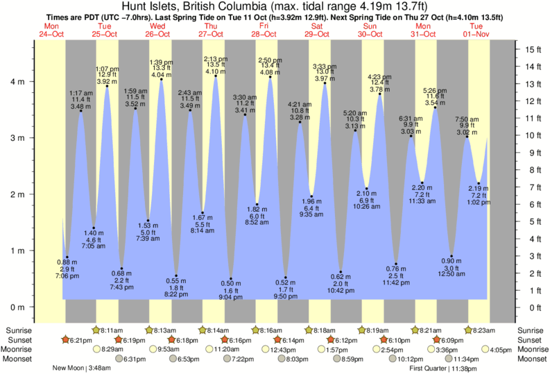 Tide Times are PST (UTC -8.0hrs). Last Spring High Tide at Hunt Islets was on Sat 20 Dec (height: 3.77m 12.4ft). Next high Spring Tide at Hunt Islets will be on Sat 03 Jan (height: 4.25m 13.9ft).