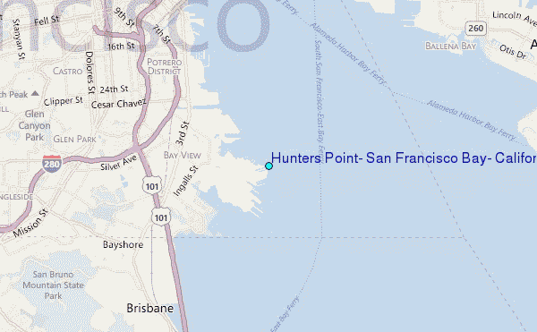 Use this relief map to navigate to tide stations, surf breaks and cities that are in the area of Hunters Point, San Francisco Bay, California.
