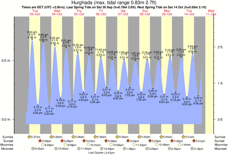 Hurghada tide chart key: The tide chart above shows the height and times of high tide and low tide for Hurghada. The grey shading corresponds to nighttime hours between sunset and sunrise at Hurghada.