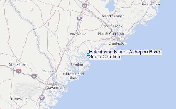 Use this relief map to navigate to tide stations, surf breaks and cities that are in the area of Hutchinson Island, Ashepoo River, South Carolina.