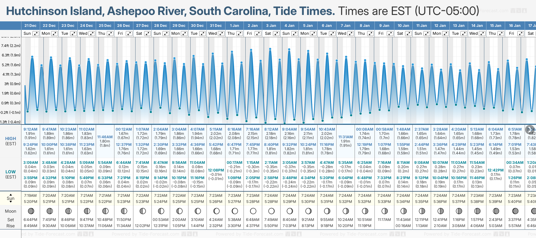December and January Tide charts for Hutchinson Island, Ashepoo River: The tide charts below show the height, time and date of high and low tides for the next 30 days.