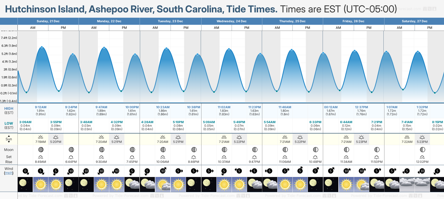 Tide Times are EST (UTC -5.0hrs). Last Spring High Tide at Hutchinson Island, Ashepoo River was on Fri 19 Dec (height: 1.93m 6.3ft). Next high Spring Tide at Hutchinson Island, Ashepoo River will be on Sat 03 Jan (height: 2.18m 7.2ft).