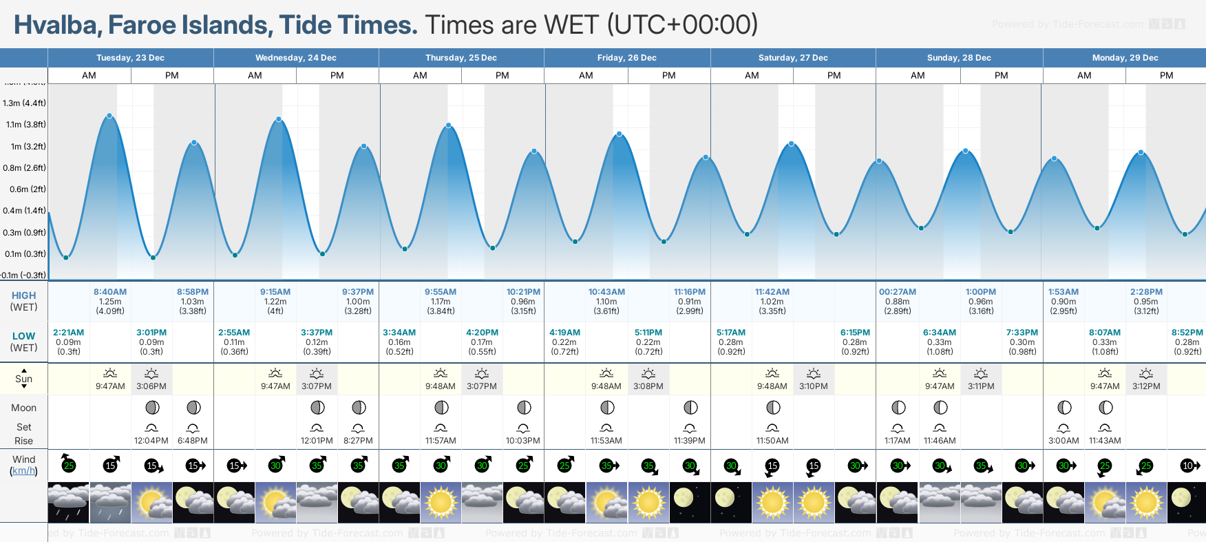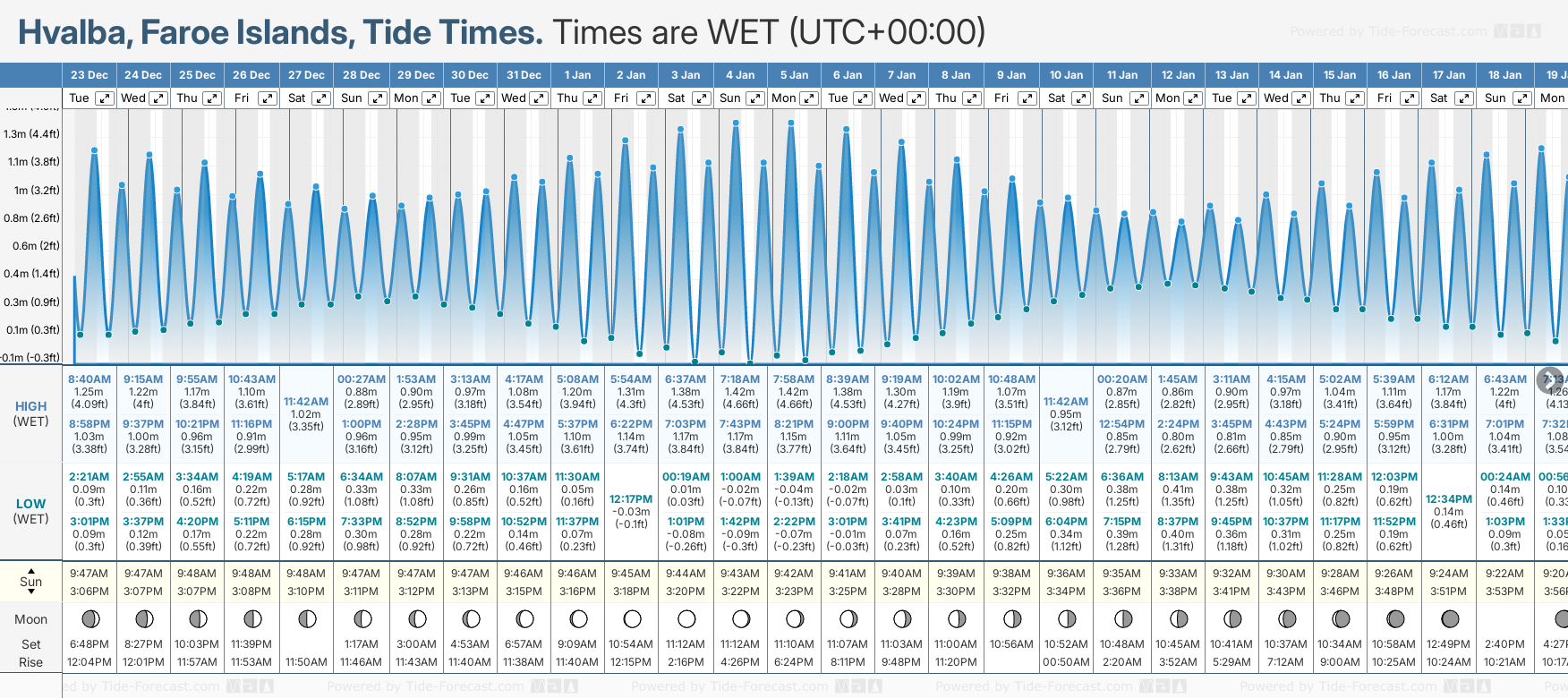 Tide Times are WET (UTC +0hrs). Last Spring High Tide at Hvalba was on Mon 22 Dec (height: 1.26m 4.1ft). Next high Spring Tide at Hvalba will be on Sun 04 Jan (height: 1.42m 4.7ft).