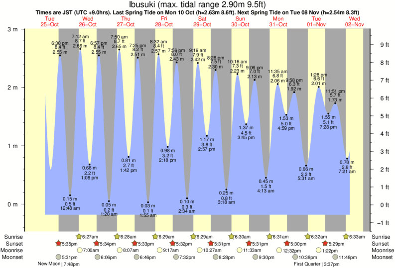Tide Times are JST (UTC +9.0hrs). Last Spring High Tide at Ibusuki was on Fri 05 Dec (height: 2.67m 8.8ft). Next high Spring Tide at Ibusuki will be on Sun 21 Dec (height: 2.37m 7.8ft).