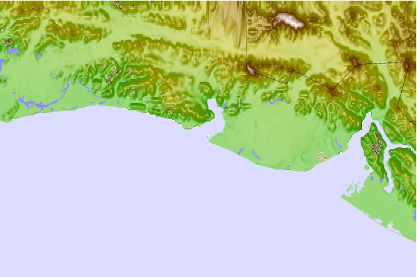 Use this relief map to navigate to tide stations, surf breaks and cities that are in the area of Icy Bay, Alaska.