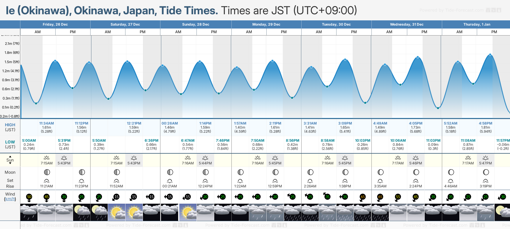 December and January Tide charts for Ie (Okinawa): The tide charts below show the height, time and date of high and low tides for the next 30 days.