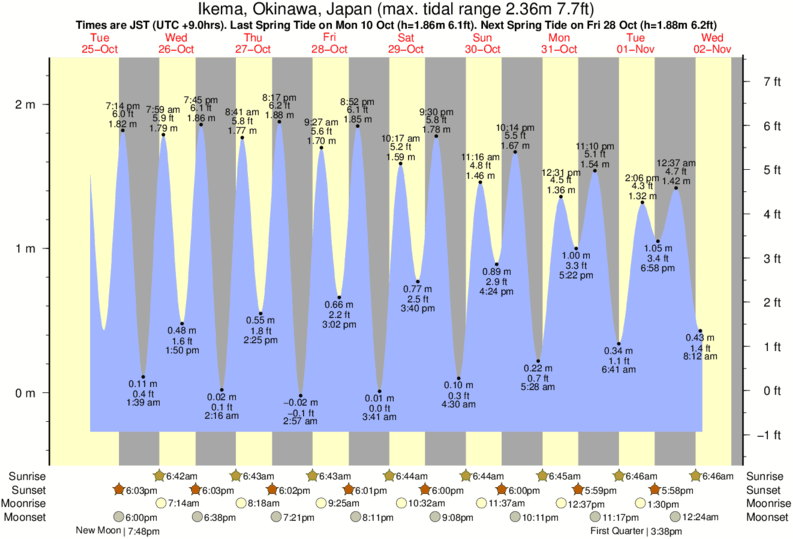 Ikema tide chart key: The tide chart above shows the height and times of high tide and low tide for Ikema, Okinawa, Japan. The grey shading corresponds to nighttime hours between sunset and sunrise at Ikema.