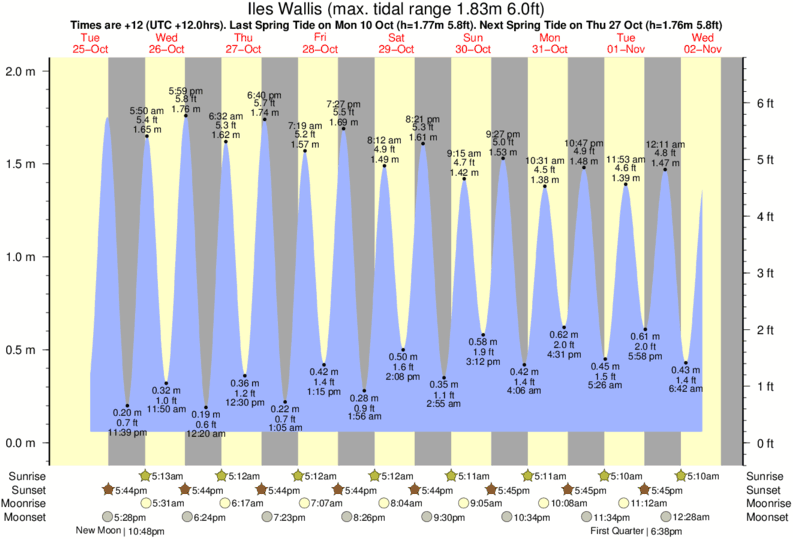 Tide Times are +12 (UTC +12.0hrs). Last Spring High Tide at Iles Wallis was on Fri 05 Dec (height: 1.88m 6.2ft). Next high Spring Tide at Iles Wallis will be on Sun 21 Dec (height: 1.56m 5.1ft).