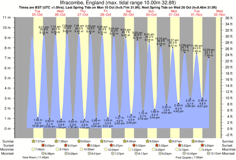 Tide chart for IlfracombeShowing low and high tide times for the next 30 days at Ilfracombe. Tide Times are GMT (UTC +0hrs).