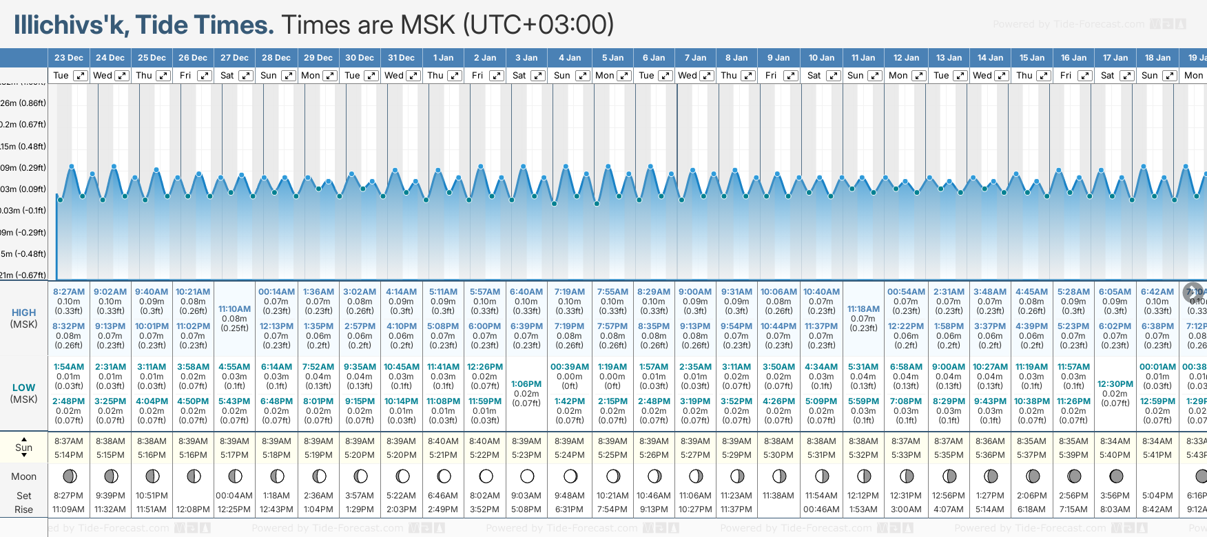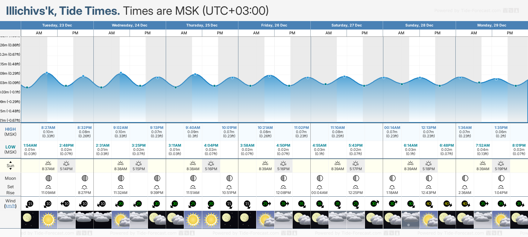 December and January Tide charts for Illichivs'k: The tide charts below show the height, time and date of high and low tides for the next 30 days.