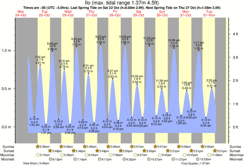 Tide Times are -05 (UTC -5.0hrs). Last Spring High Tide at Ilo was on Sat 06 Dec (height: 1.26m 4.1ft). Next high Spring Tide at Ilo will be on Sun 04 Jan (height: 1.27m 4.2ft).