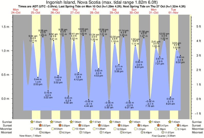 Tide Times are AST (UTC -4.0hrs). Last Spring High Tide at Ingonish Island was on Sat 06 Dec (height: 1.51m 5.0ft). Next high Spring Tide at Ingonish Island will be on Sat 20 Dec (height: 1.37m 4.5ft).