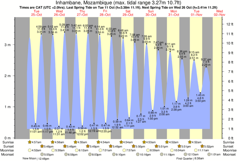Tide Times are CAT (UTC +2.0hrs). Last Spring High Tide at Inhambane was on Sat 06 Dec (height: 3.30m 10.8ft). Next high Spring Tide at Inhambane will be on Mon 05 Jan (height: 3.29m 10.8ft).