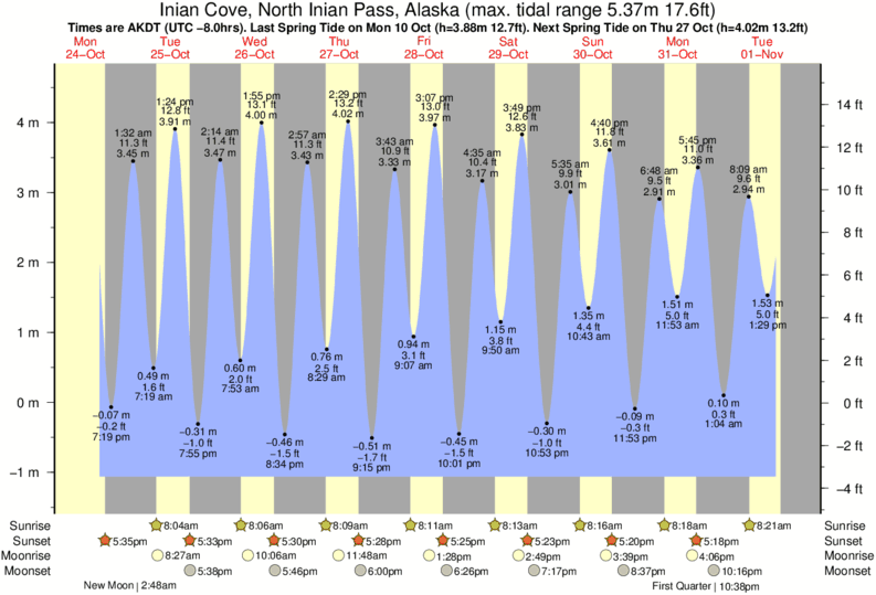 Inian Cove, North Inian Pass tide chart key: The tide chart above shows the height and times of high tide and low tide for Inian Cove, North Inian Pass, Alaska. The grey shading corresponds to nighttime hours between sunset and sunrise at Inian Cove, North Inian Pass.