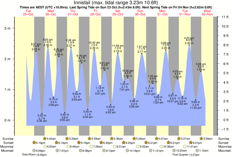 Innisfail tide chart key: The tide chart above shows the height and times of high tide and low tide for Innisfail. The grey shading corresponds to nighttime hours between sunset and sunrise at Innisfail.