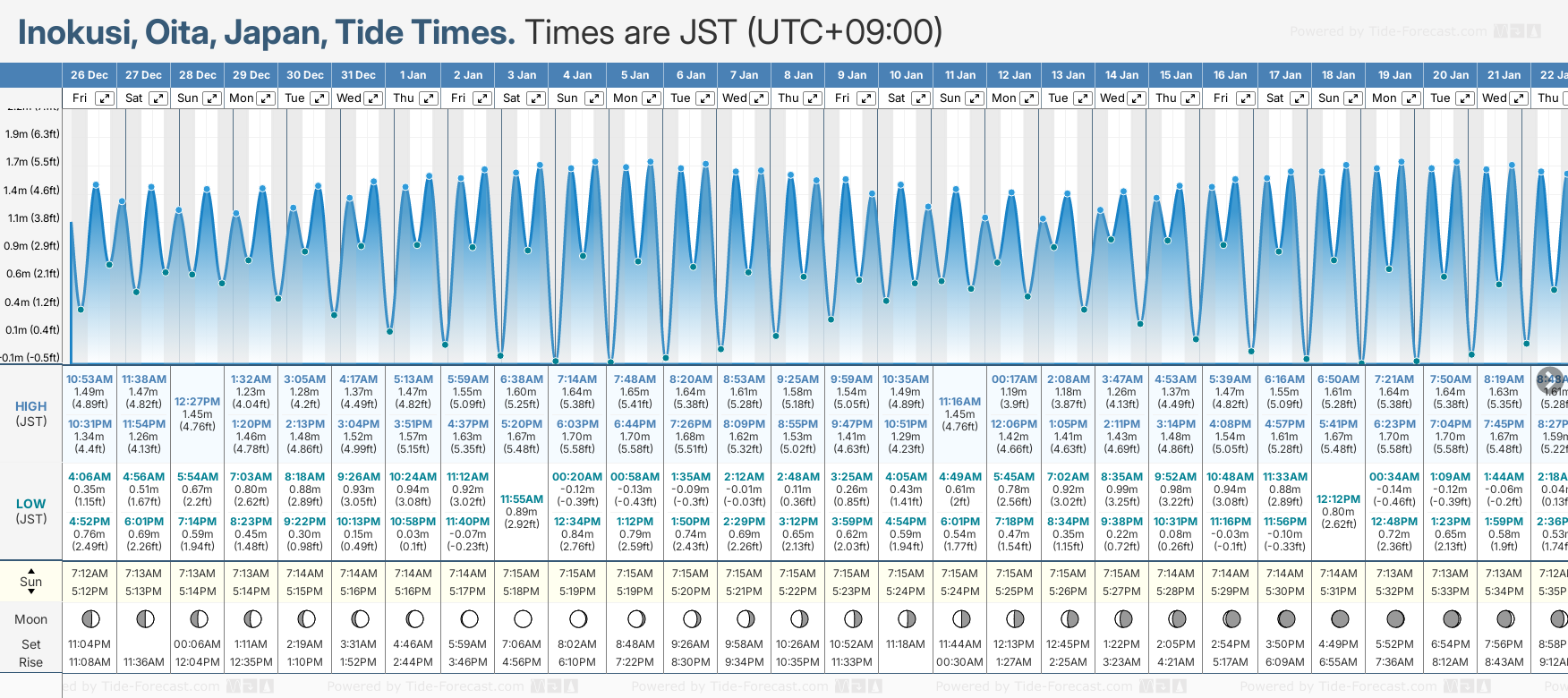 December and January Tide charts for Inokusi: The tide charts below show the height, time and date of high and low tides for the next 30 days.