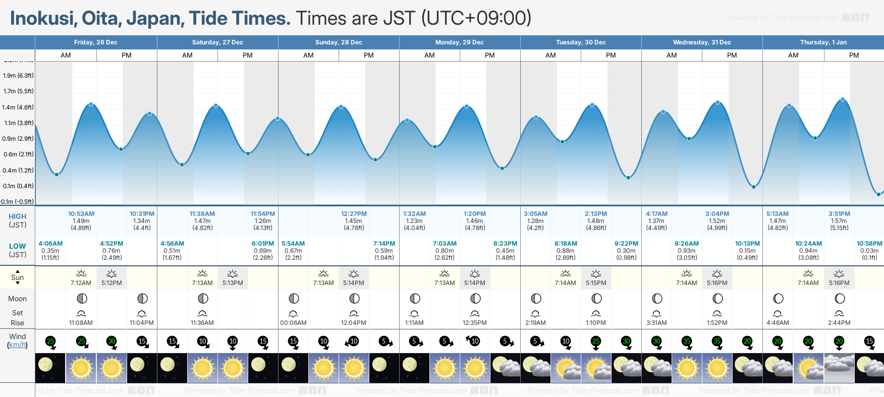 Tide Times are JST (UTC +9.0hrs). Last Spring High Tide at Inokusi was on Mon 22 Dec (height: 1.73m 5.7ft). Next high Spring Tide at Inokusi will be on Mon 05 Jan (height: 1.70m 5.6ft).