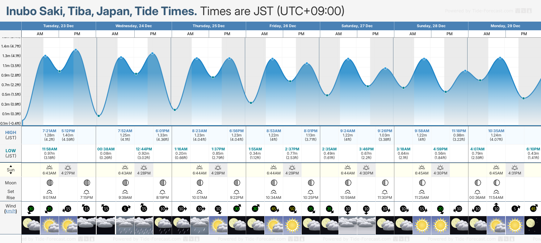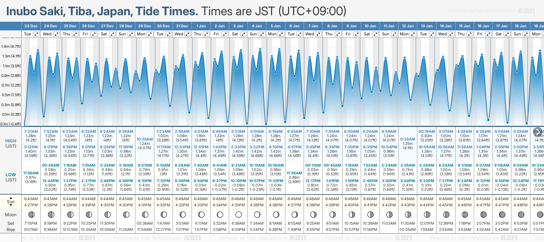 December and January Tide charts for Inubo Saki: The tide charts below show the height, time and date of high and low tides for the next 30 days.
