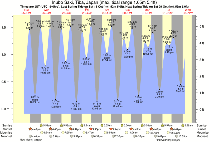 Tide Times are JST (UTC +9.0hrs). Last Spring High Tide at Inubo Saki was on Sun 21 Dec (height: 1.46m 4.8ft). Next high Spring Tide at Inubo Saki will be on Mon 05 Jan (height: 1.42m 4.7ft).