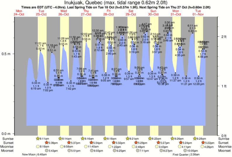 Tide Times are EST (UTC -5.0hrs). Last Spring High Tide at Inukjuak was on Mon 08 Dec (height: 0.60m 2.0ft). Next high Spring Tide at Inukjuak will be on Sat 20 Dec (height: 0.56m 1.8ft).
