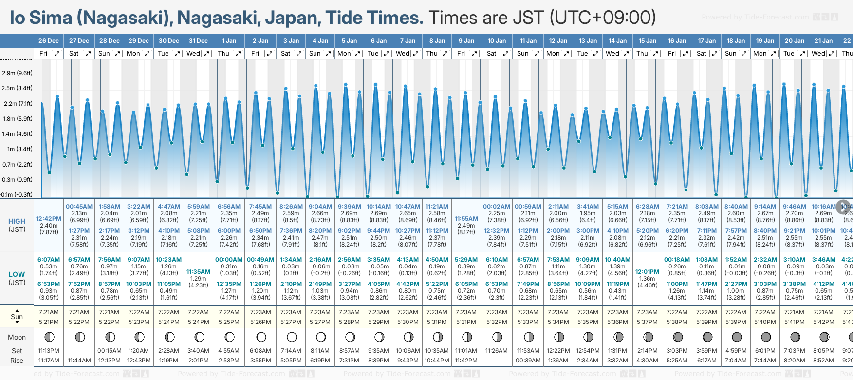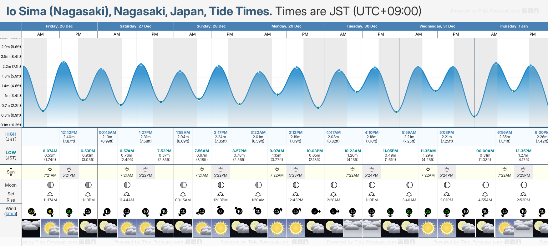 December and January Tide charts for Io Sima (Nagasaki): The tide charts below show the height, time and date of high and low tides for the next 30 days.
