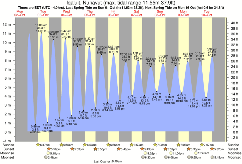 December and January Tide charts for Iqaluit: The tide charts below show the height, time and date of high and low tides for the next 30 days.