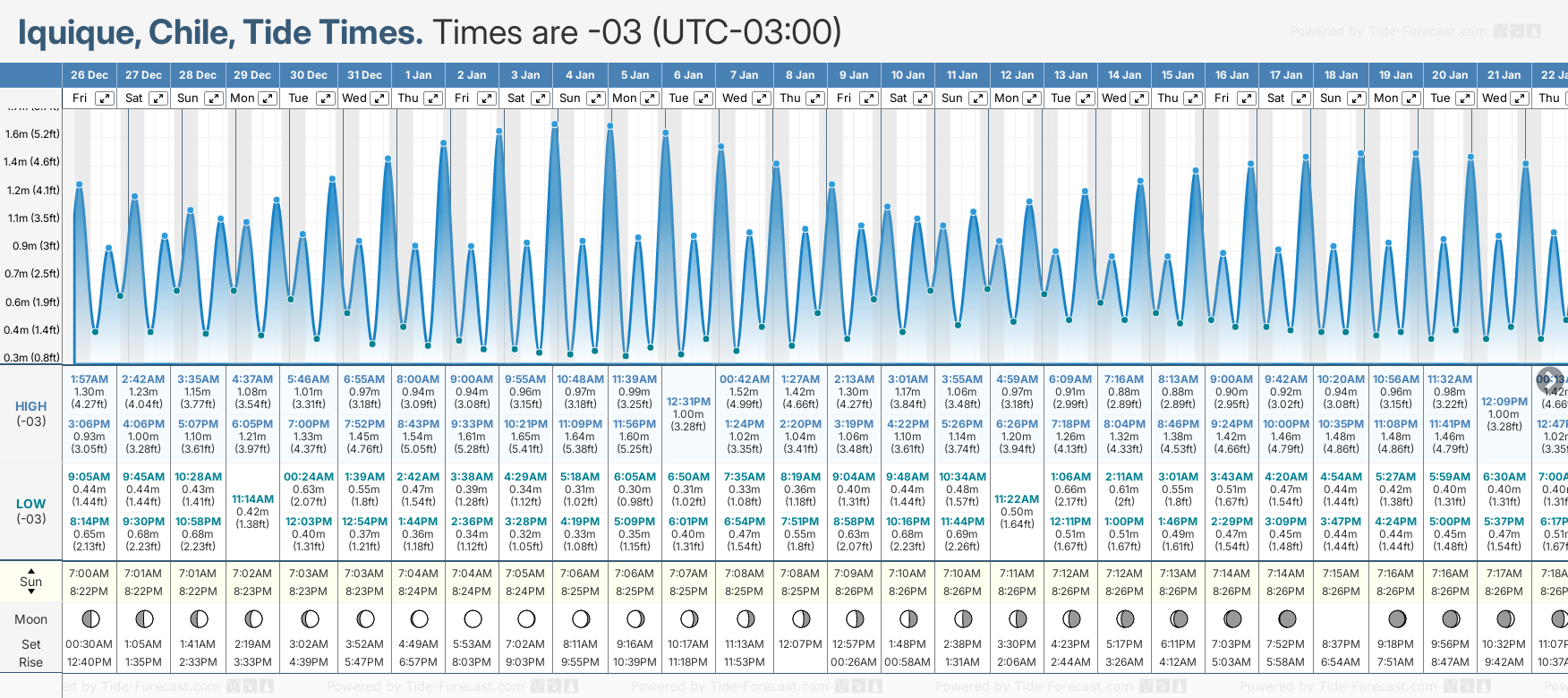 December and January Tide charts for Iquique: The tide charts below show the height, time and date of high and low tides for the next 30 days.