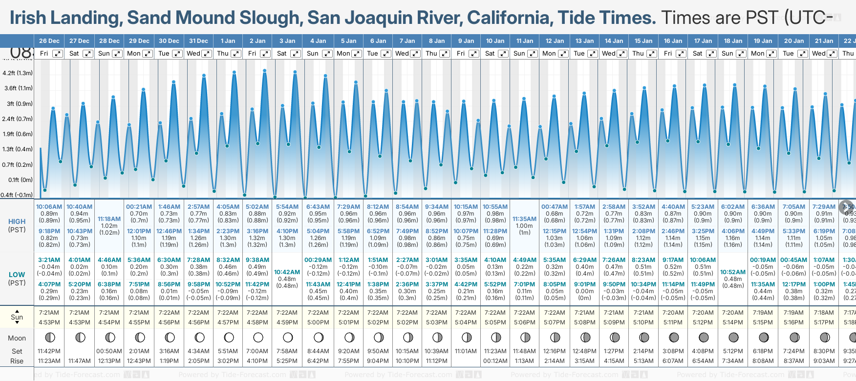 December and January Tide charts for Irish Landing, Sand Mound Slough, San Joaquin River: The tide charts below show the height, time and date of high and low tides for the next 30 days.