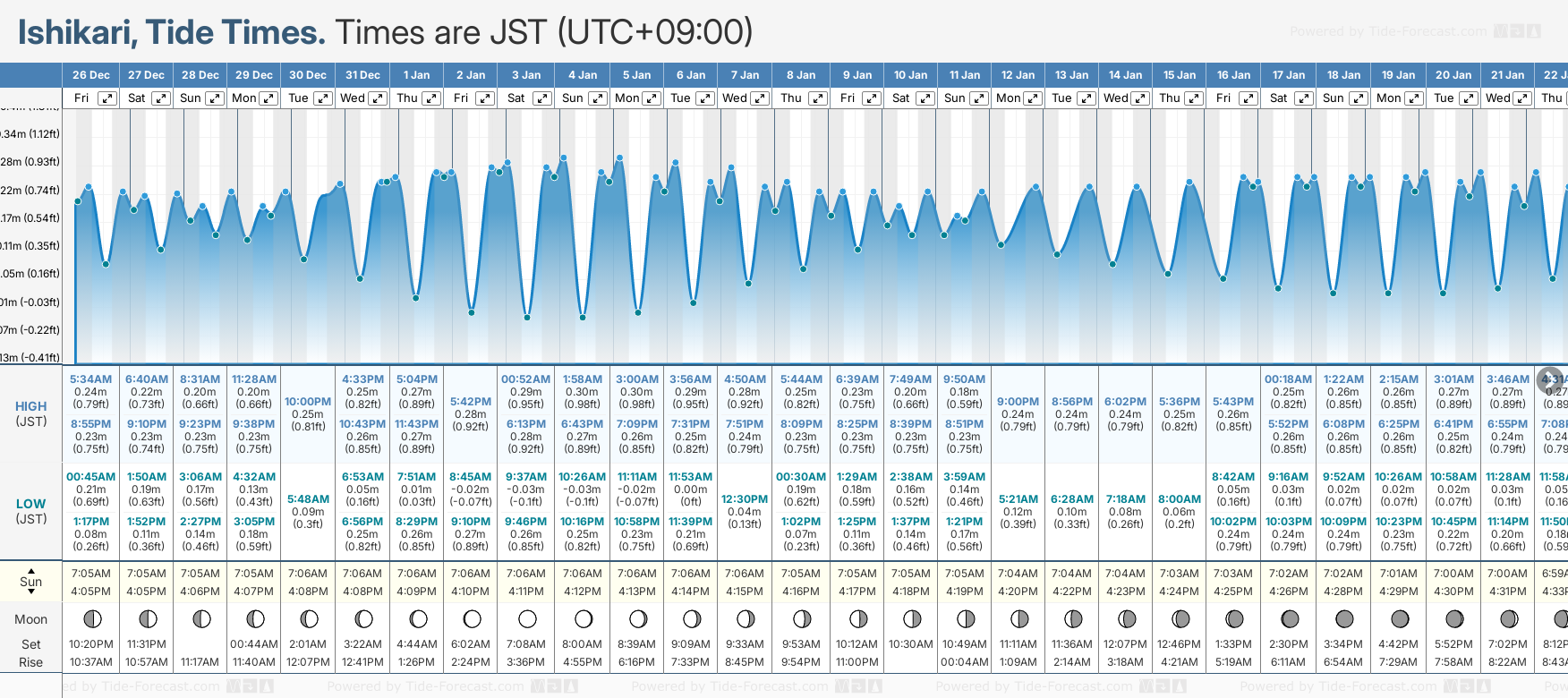 December and January Tide charts for Ishikari: The tide charts below show the height, time and date of high and low tides for the next 30 days.