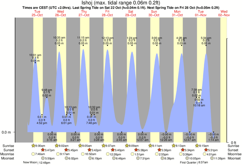 Tide Times are CET (UTC +1.0hrs). Last Spring High Tide at Ishoj was on Fri 19 Dec (height: 0.05m 0.2ft). Next high Spring Tide at Ishoj will be on Thu 01 Jan (height: 0.06m 0.2ft).