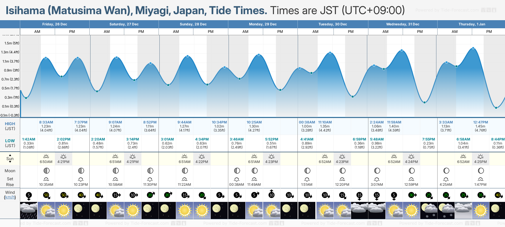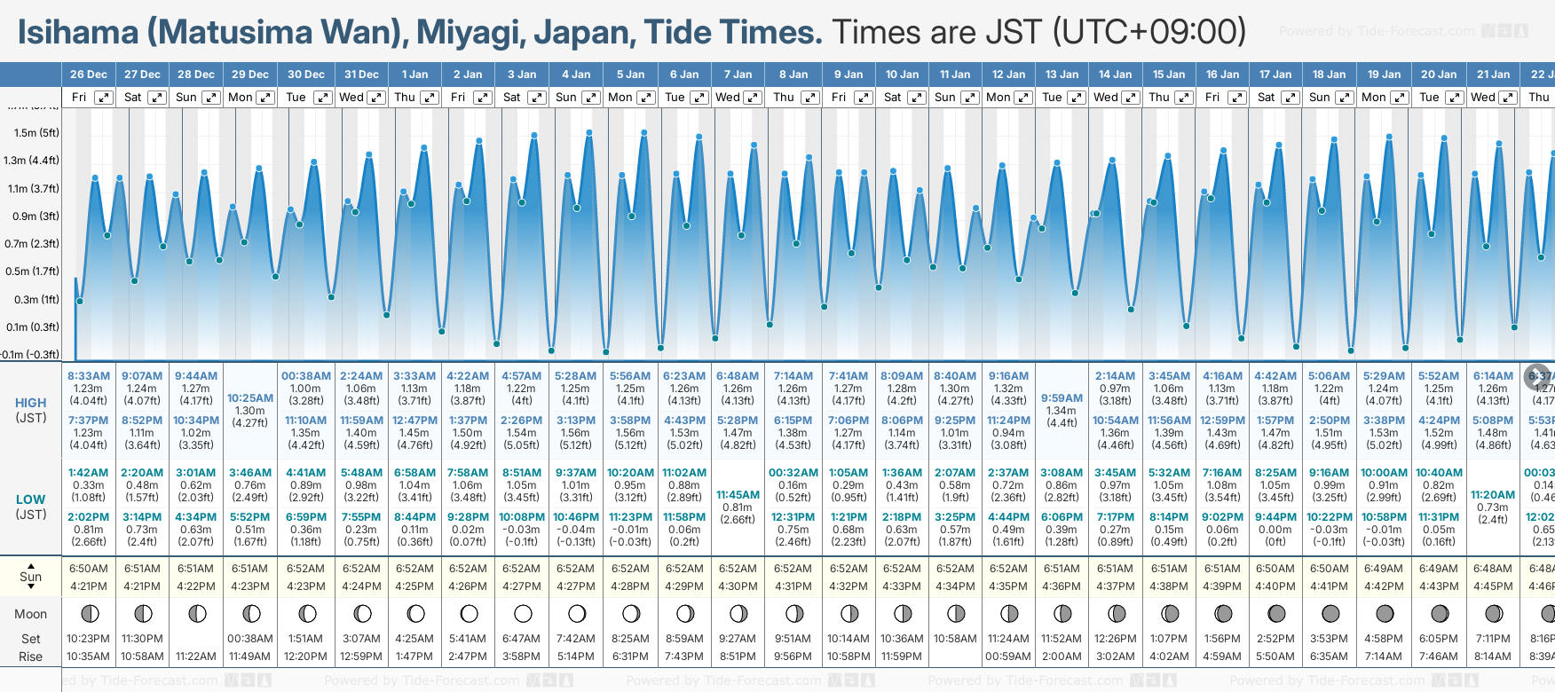 December and January Tide charts for Isihama (Matusima Wan): The tide charts below show the height, time and date of high and low tides for the next 30 days.