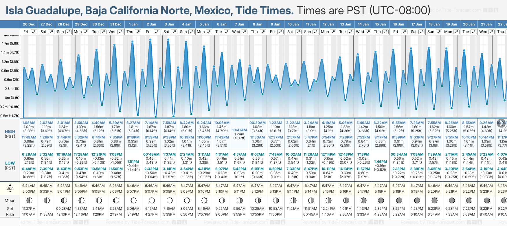 December and January Tide charts for Isla Guadalupe: The tide charts below show the height, time and date of high and low tides for the next 30 days.