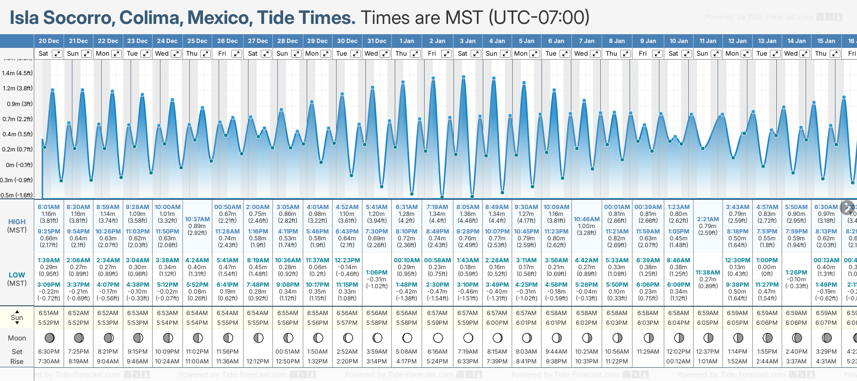 Tide Times are MST (UTC -7.0hrs). Last Spring High Tide at Isla Socorro was on Sun 21 Dec (height: 1.16m 3.8ft). Next high Spring Tide at Isla Socorro will be on Sat 03 Jan (height: 1.36m 4.5ft).