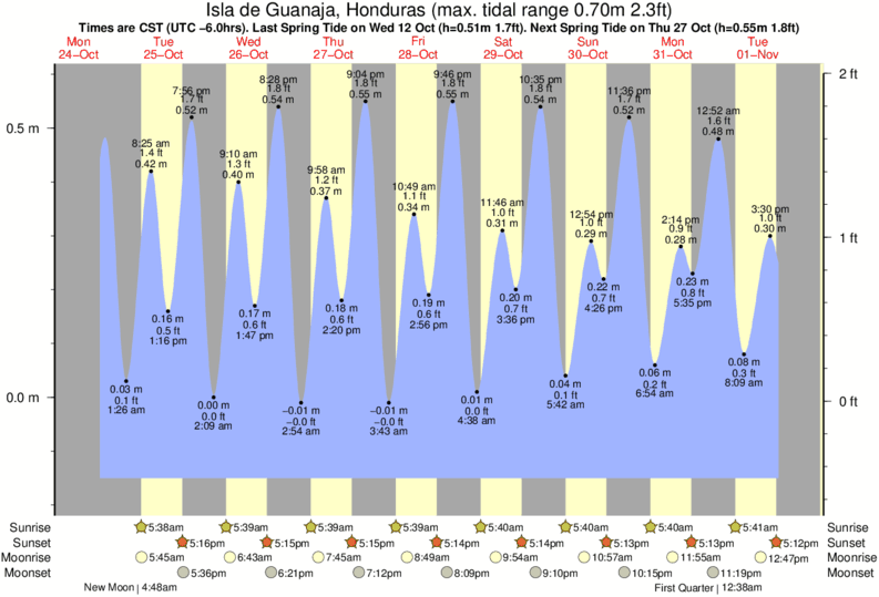 Tide Times are CST (UTC -6.0hrs). Last Spring High Tide at Isla de Guanaja was on Fri 05 Dec (height: 0.57m 1.9ft). Next high Spring Tide at Isla de Guanaja will be on Sat 20 Dec (height: 0.44m 1.4ft).
